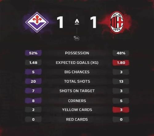 北京时间22:00,意甲第20轮,米兰客场对阵佛罗伦萨。上半场,普利西奇两失单刀,德赫亚屡献神扑。下半场,科穆佐破门帮助佛罗伦萨取得领先,恩昆库90分钟绝平。最终,米兰1-1战平佛罗伦萨。